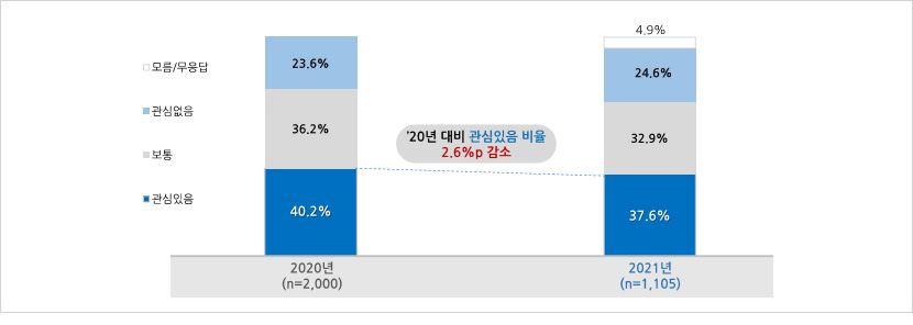 - 평소 우리나라 사회·정치 문제에 대한 관심이 있는 학생은 37.6%로 전년도 대비 2.6%p 감소함