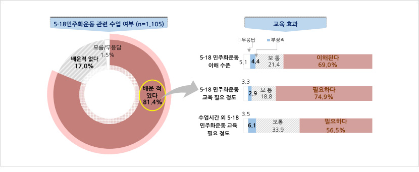 - 학교 수업시간에 5·18 민주화운동에 대해 배운 적 있다는 응답은 81.4%로 대다수임