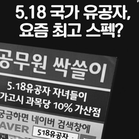 ‘5·18유공자’, 1990년 당시 화폐로 1인당 평균 5,800만원 받았다. 최고액은 3억 1,700만원, 최저액 500만원. 19세에 경찰을 닭장차에 가두었다는 공로로 2억을 보상받은 윤기권은 2001년 월북해 대남방송하고 있다. 이만이 아니다. 매월 연금을 받는다. 최고는 월 4,226,000원, 최저는 월 362,000원. 1990년의 4억, 지금의 화폐 단위로 환산하면 얼마일까? 태극무공훈장, 그 수훈자가 사망하면 참모총장이 상주가 되는 엄청난 훈장이다. 그런데도 6·25전투에서 태극무공훈장을 받은 사람은 월 18만원만 받는다.‘5·18유공자’, 본인 배우자 자녀들 모두 국가고시, 임용고시에 5-10% 가산점을 받아 정부기관, 국가기관, 경찰, 법원, 검찰, 교원, 정부산하기관, 국영기업 등의 자리를 거의 싹쓸이하고 있다. 금융기관 대기업 일자리까지 최우선으로 차지한다. 채용시험이 필기·실기·면접 등으로 구분되어 실시되는 경우에는 각 시험마다 가점을 받으며, 둘 이상의 과목으로 실시되는 시험에 있어서는 각 과목별로 가점을 받는다. 머리 좋은 젊은이들이 고시촌에서 고생하며 5수 10수하면서도 탈락하는 이유가 여기에 있다.- 5·18유공자가 누리는 귀족대우 - [10% 가산점에 병역감면까지 받는 금수저] 전단지 2004년의 통계만 보아도 5-10% 가산점을 받는 5·18유공자 자식들이 공무원 7급의 89.4%, 9급의 85.6%를 독차지 했습니다. 법원 검찰 서기의 95%가 그들입니다. 그러니 공시생들에 남은 자리가 어디 있습니까? - 2017.3.26. 지만원의 시스템클럽지만원 등 극우보수 세력은 5·18유공자를 비방하면서 △거액의 보상금과 연금 수령 △유공자 가산점을 통한 공직 싹쓸이를 근거로 들고 있다. 특히 6·25 참전용사 등 타 유공자와의 수혜 비교를 통해 5·18유공자가 지나친 특혜를 받고 있다고 강조한다. 왜곡·폄훼의 양상은 다음 세대의 권익마저 위태롭게 만든다는 식으로 전개된다. 예컨대 유공자 가산점의 경우 자녀의 취업 문제와 결부시켜 위화감을 조장한다. 극우보수 세력의 프레임 안에서 5·18유공자는 대한민국의 특권층으로 나머지 다른 집단에게 피해를 끼치는 존재일 뿐이다.
