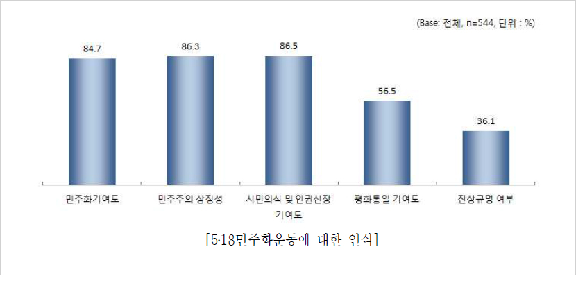 높고, 다음으로 ‘5·18기념행사 향후 참여 의사(85.9점)’, ‘5·18민주화운동의 정신 구현 정도(85.1점)’ 등의