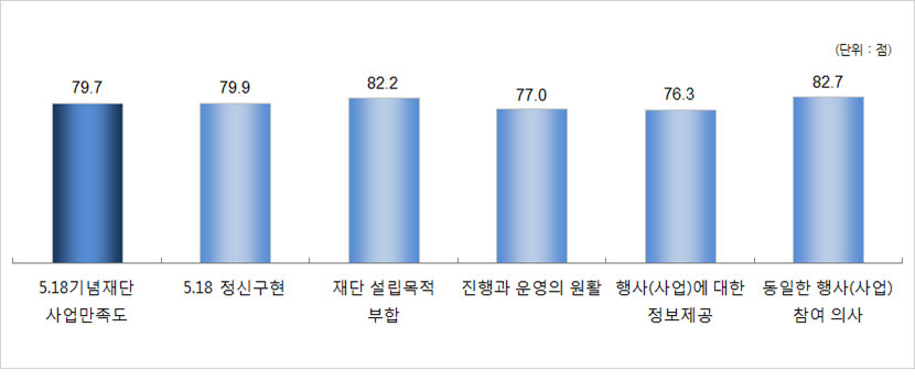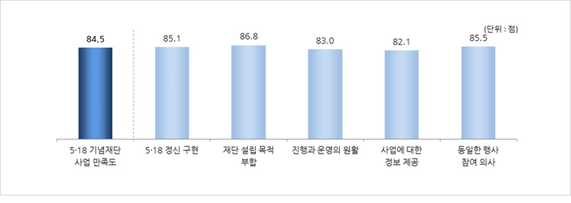 - 5·18 기념재단 평가지수를 구성하는 항목 중 ‘5·18 기념재단 사업만족도’는 84.4점,