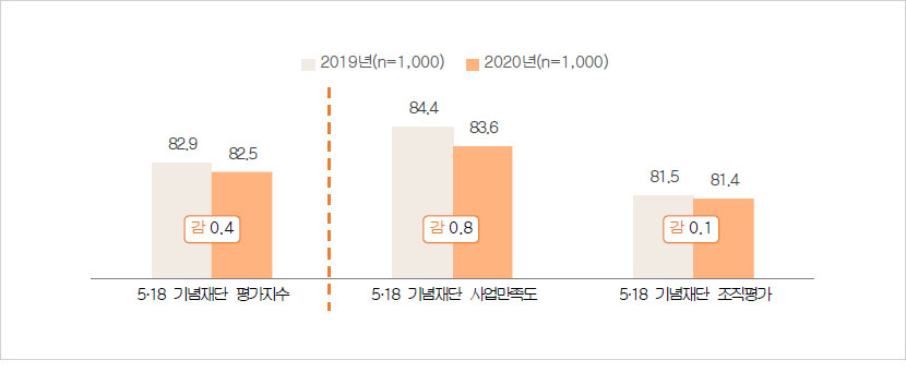 - 2020년 ‘5·18 기념재단 평가지수’는 82.5점으로 2019년(82.9점)에 비해 0.4점 하락함.