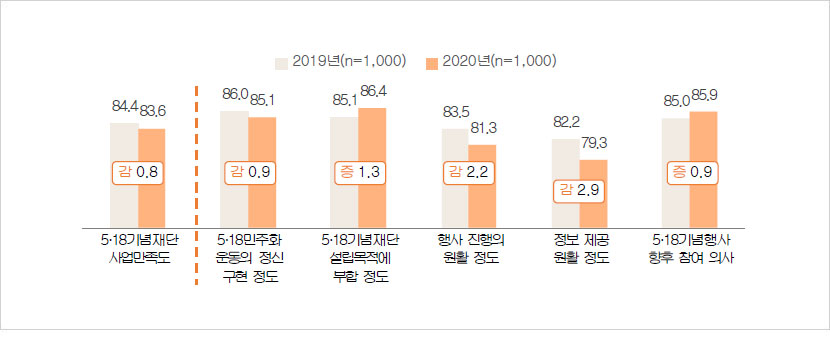 - 2019년 ‘5·18 기념재단 사업만족도’는 84.4점으로 2018년(85.6점)에 비해 1.2점