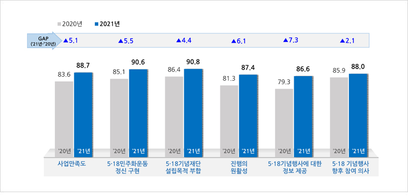- 2021년 ‘5·18 기념재단 사업만족도’는 88.7점으로 2020년(83.6점)에 비해 5.1점 상승함