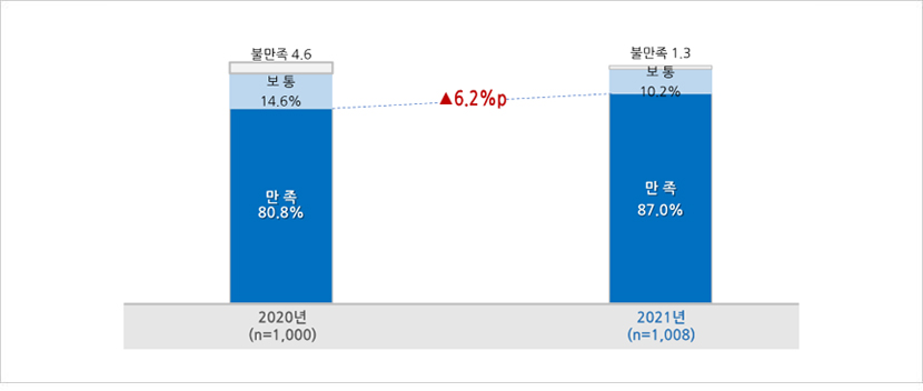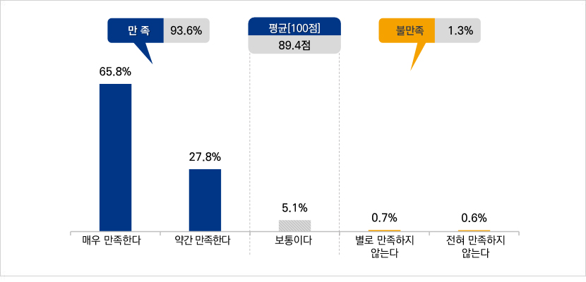 - ‘불만족’은 1.3%(전혀 만족하지 않는다 0.6% + 별로 만족하지 않는다 0.7%)로 조사됨