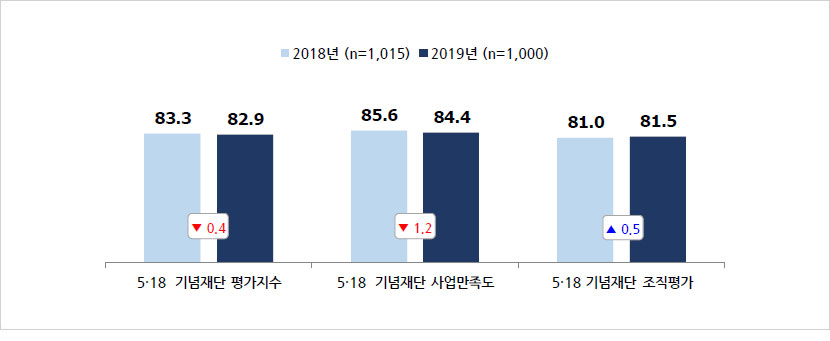 - 2019년 ‘5·18 기념재단 평가지수’는 82.9점으로 2018년(83.3점)에 비해 0.4점 하락함