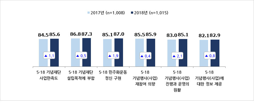 - 2018년 ‘5·18 기념재단 사업만족도’는 85.6점으로 2017년(84.5점)에 비해 1.1점 상승함