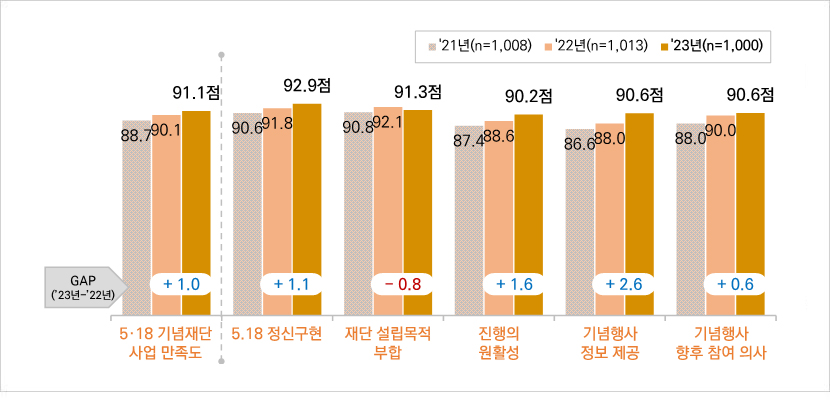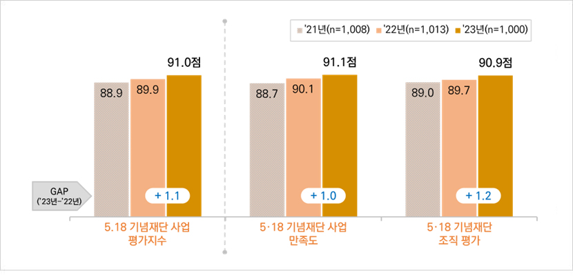 - 2023년 5·18 사업참여자 대상 5·18 기념재단의 사업 평가지수는 91.0점으로 2022년(89.9점) 대비 1.1점 상승함