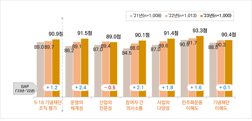 - ‘조직평가’를 구성하는 항목 중 ‘5·18민주화운동의 이해도’가 90.5점으로 가장 높고, 이어 ‘5·18기념재단의 이해도’(88.5점), ‘사업의 전문성’, ‘사업의 다양성’(각 87.0점) 등의 순임